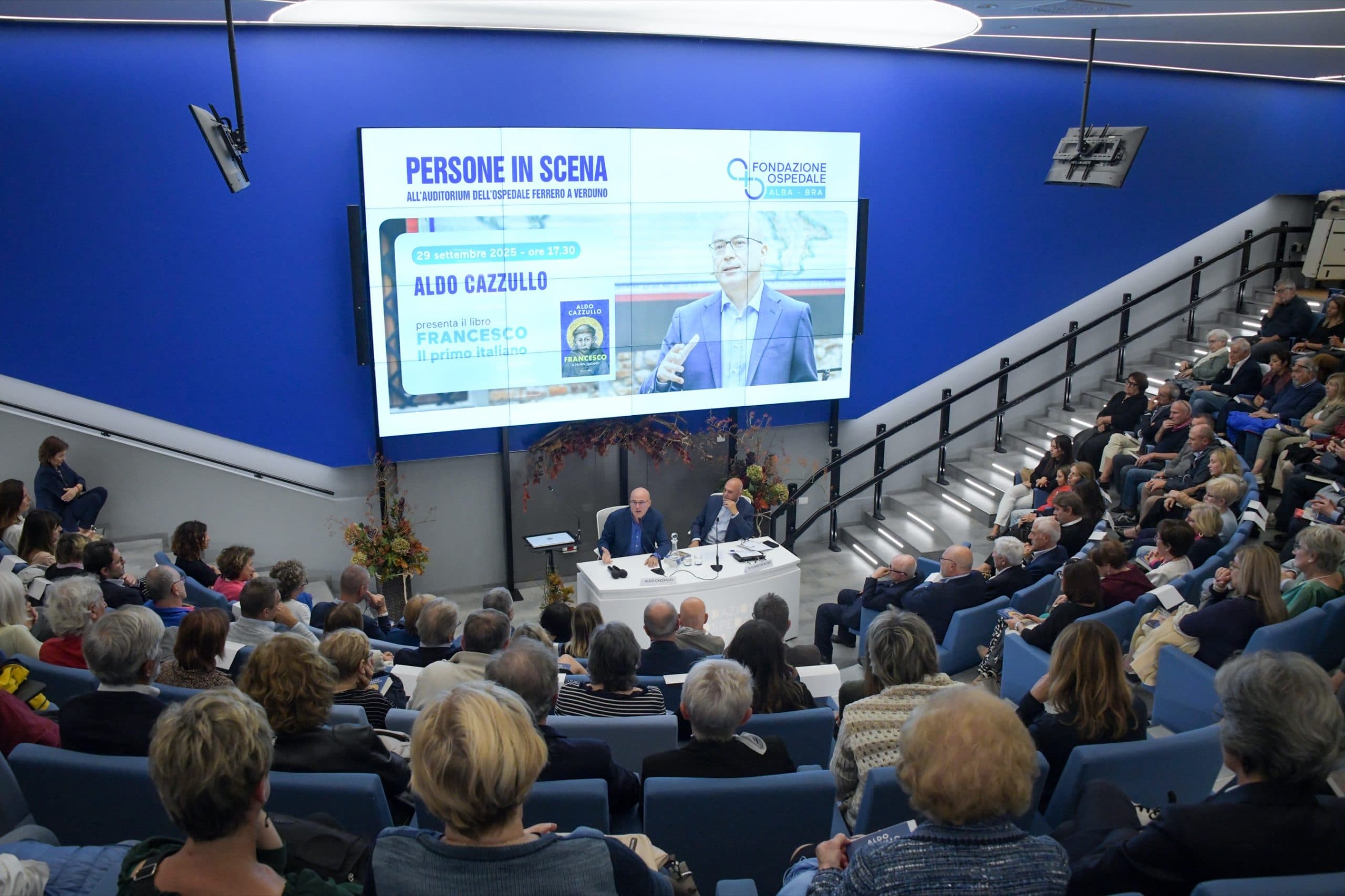 In apertura dell’incontro, Cazzullo ha ricordato la lunga degenza del padre e la qualità dell’ assistenza nell’Ospedale Ferrero complimentandosi con la Direttrice Generale dell’ASL N2 Paola Malvasio per il l’efficienza, la professionalità e la gentilezza ricevuta dalle varie equipe e il Presidente Bruno Ceretto e  per il supporto dato dalla Fondazione. La serata è proseguita con un dialogo a due che ha permesso di approfondire la figura di San Francesco, nell’anno dell’ottavo centenario del Cantico delle Creature, in assoluto la prima poesia nella lingua del popolo offrendo al pubblico una riflessione sulla sua influenza storica e spirituale e sul ruolo che la sua figura continua a rivestire nella costruzione dell’identità italiana e nella cultura italiana anche nel contesto attuale.